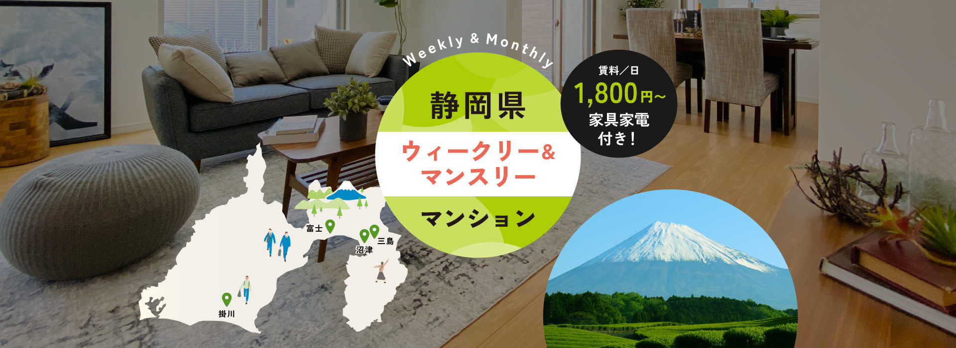 ジャパンマンスリーが提供する静岡県掛川市のマンスリー・ウィークリーマンションの賃料利用相場は、 約2500円~3000円程度で、部屋タイプとしては1Kが一般的です。25㎡前後の広さの物件が多く、 法人様の出張や研修、一時的な仮住まいとして利用するのにぴったりです。 室内には洗濯機や冷蔵庫、テレビといった家電がもとから設置されており、 鞄一つで身軽に利用できるほど快適な備品が元から備わっているので、急なご利用の際も重宝します。 掛川駅徒歩圏内の物件が多く、利便性に優れた立地に有りますので観光の拠点としても大変便利です。