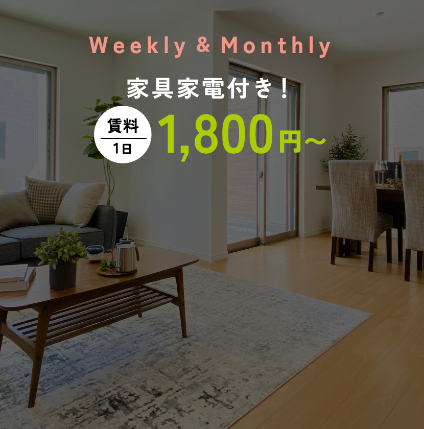 | 2,600円/日 | 2,100円/日 | 2,000円/日 | 家具家電 付き賃貸 |